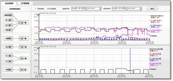 管理運行主要包含站間管線監(jiān)測以及井場管線監(jiān)測,主要以實時與歷史曲線方式體現。 站間管網曲線重點對各站點對點集輸或插輸管線的流量、壓力實時監(jiān)測,井場管線重點以井場回壓實時監(jiān)測。