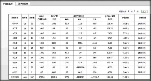 生產運行主要包括產液量監(jiān)控與注水量監(jiān)控,產量液量監(jiān)控主要體現全區(qū)所有站的開井數、計劃產量、前日產量、當日輸出、當日庫存、當日產進量、功計產量、產量進度數據。 油井產量分析界面重點體現增壓站所管轄井場各油井當日產量、昨日產量、井場產量、較昨日差值、油井狀態(tài)、工況分析結果、功圖分析、原因分析。 注水量監(jiān)控主要體現昨目注水量、當日注水量、折算配注量、以及配注差、配注進度。水井產量分析主要體現各站閥組的分壓、管壓、日注水量、日配注量、瞬時流量、累積流量、水井配注。