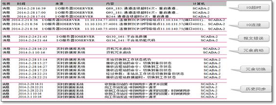 事件系統(tǒng)重點記錄整個SCADA系統(tǒng)的運行情況,在服務端與客戶端所記錄的內容方式有所不同,分別為冗余服務器日志、歷史服務器日志、客戶端操作日志。