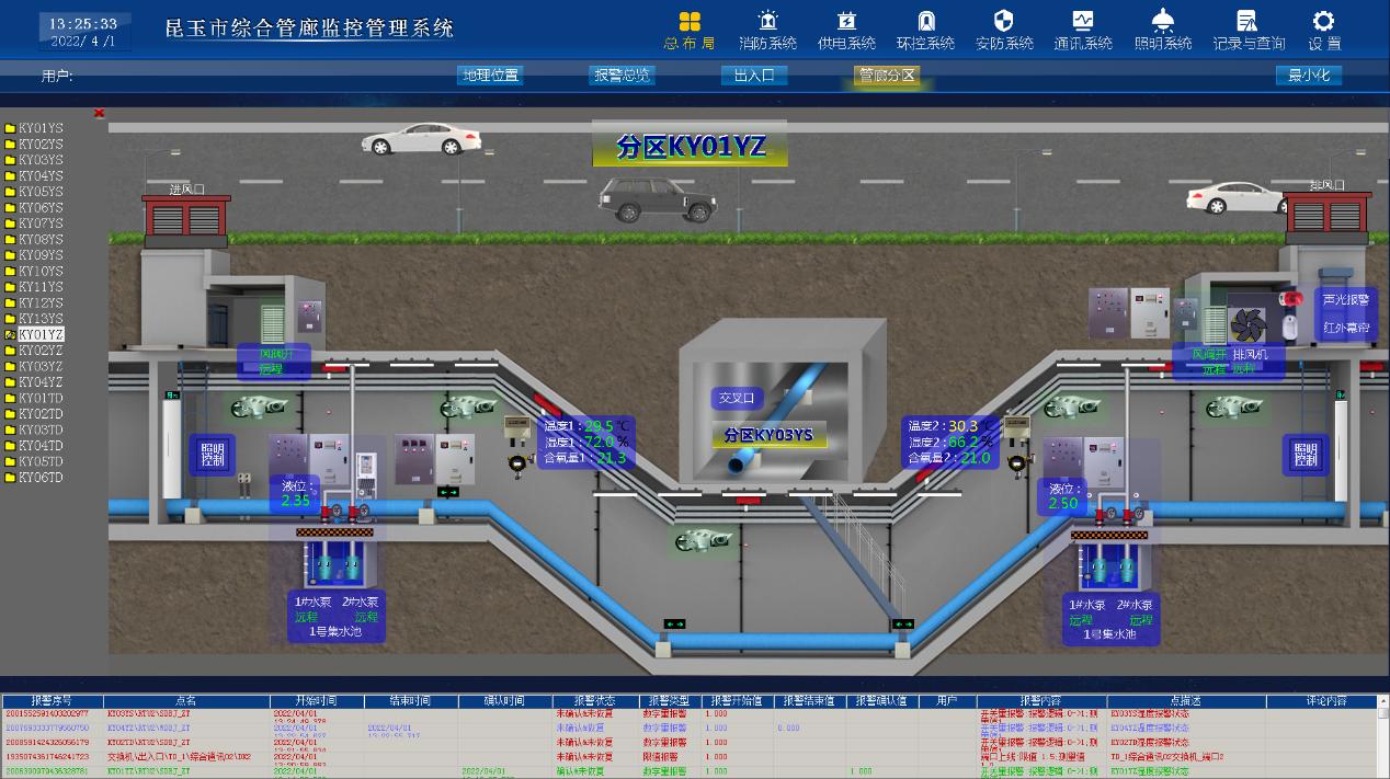 通過3D模型的方式展示綜合管廊監(jiān)控中心、防火分區(qū)、設(shè)備間地理分布圖和重要設(shè)備地理分布圖如管道閥門,在地圖上展示系統(tǒng)區(qū)域主要運行信息,并顯示鼠標靠近區(qū)域詳細運行信息,單擊鼠標切換對應區(qū)域的詳細工藝畫面或功能畫面。 當發(fā)生管道泄漏、非法入侵、發(fā)生火災、設(shè)備運行異常等報警時,系統(tǒng)迅速對報警發(fā)生的防火分區(qū)或設(shè)備間進行定位,在地圖上對應區(qū)域進行警示性閃爍,同時結(jié)合報警聲音,提醒值班人員進行報警處理。