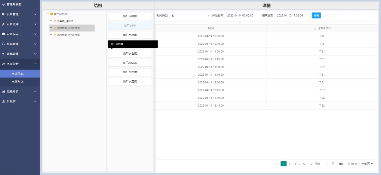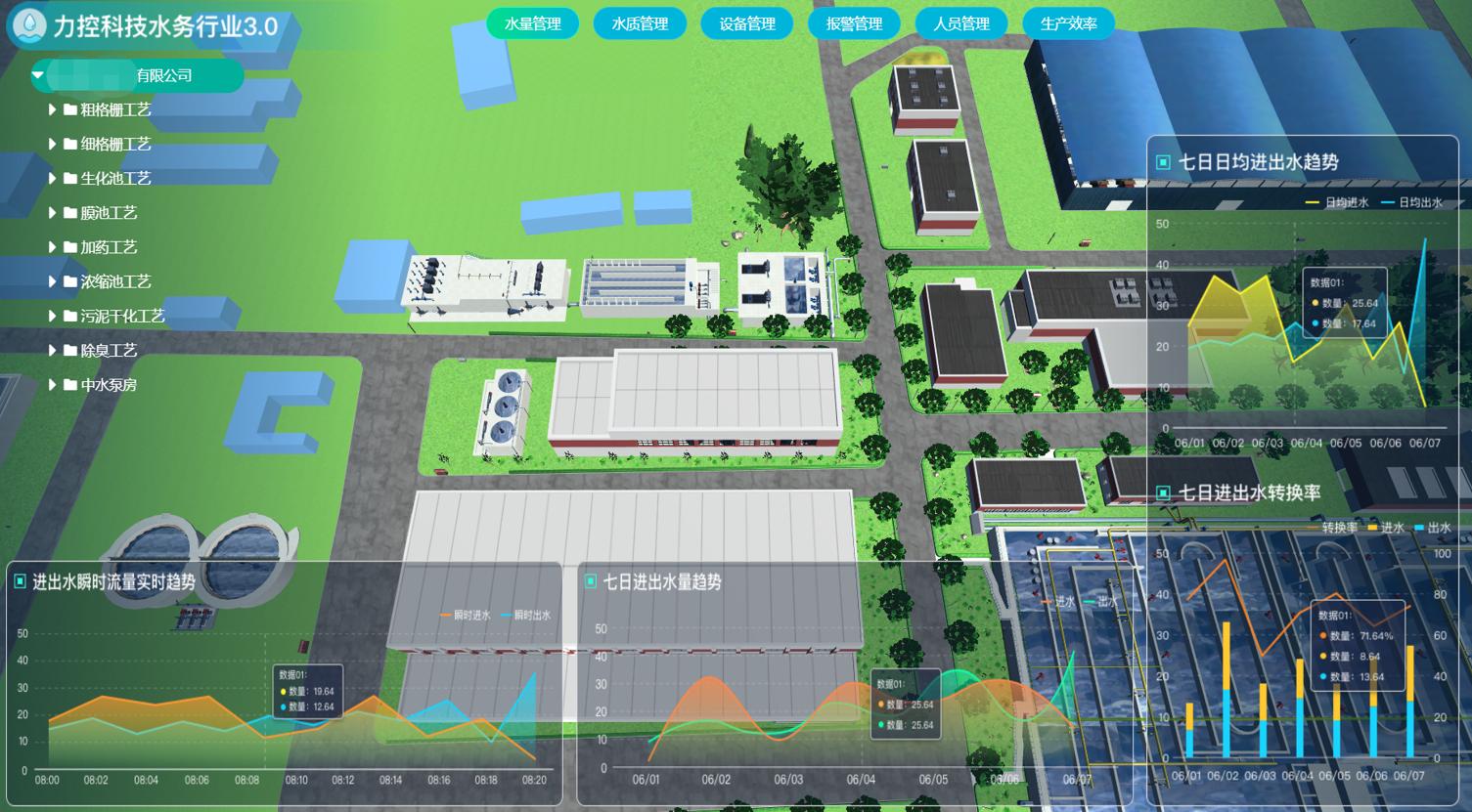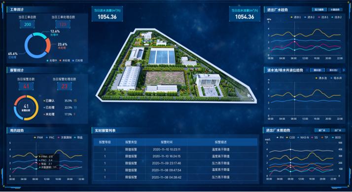 直觀展示廠區生產運行情況,如進出水當日流量,進出水相關水質參數對比(化學需氧量、生物需氧量、氨氮、總氮、懸浮物、總磷),設備類型統計、報警信息統計、用藥趨勢、流量趨勢、進出水壓力趨勢、液位趨勢等重點關注信息。