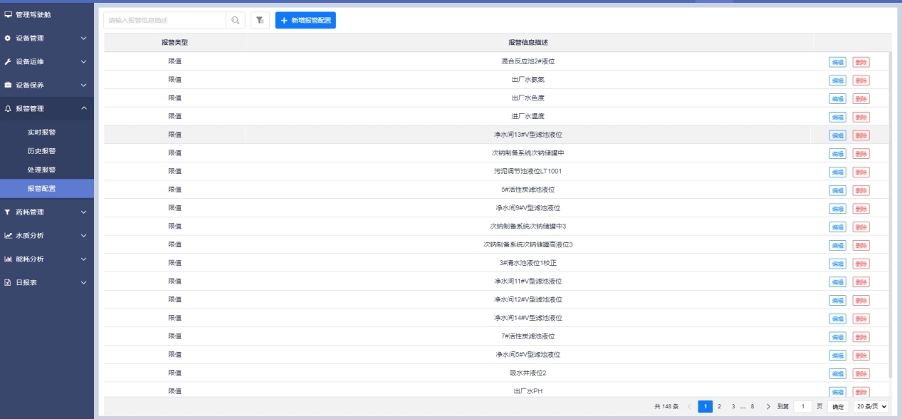 能夠按照測點靈活配置廠區生產運行過程中設備及工藝流程參數的報警產生規則、如限值報警、開關報警、組合報警等規則,按照配置的測點信息填寫報警描述,如水質異常、壓力異常等報警描述。