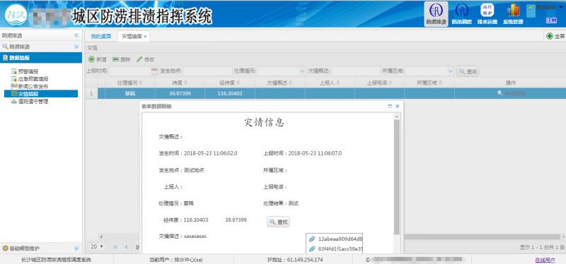 汛情發(fā)生后,通過已被調度的各個模塊來對事故進行處理,合理安排泵站的抽排水、搶險車輛和搶險隊伍等對人員物資的搶救,按照應急預案有條不紊的應對各種突發(fā)事故。對已經完成的搶險救災任務形成簡報,地圖展示位置信息,可查看處理結果,對搶險救災任務進行總結,用最優(yōu)的措施保障人民生命財產安全。