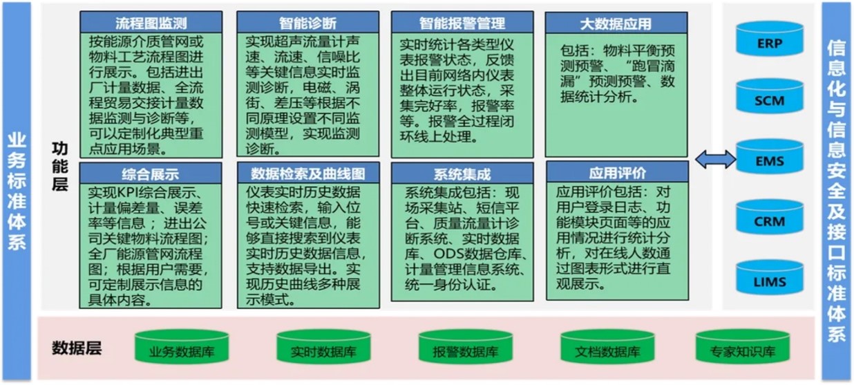 系統(tǒng)具備標準化輸出接口或數(shù)據(jù)共享接口,為上位管理系統(tǒng)提供數(shù)據(jù)集成服務,可以把計量儀表實時狀態(tài)信息、儀表在線率、采集完好率、報警率、處理結果信息推送到上層應用系統(tǒng);把系統(tǒng)產生的重要報警推送給上位管理系統(tǒng),同時通過計量管理信息系統(tǒng)、MES系統(tǒng)等獲取基礎信息,用戶維護一套臺賬,通過接口實現(xiàn)信息共享調用。