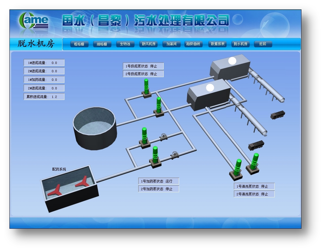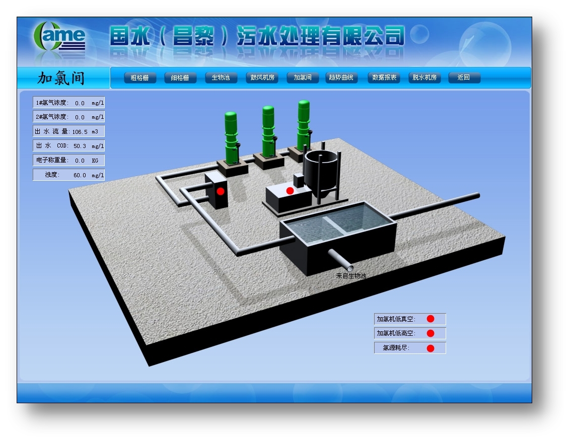系統(tǒng)以美觀、友好的界面顯示設(shè)備運(yùn)行狀態(tài)、流量、水位、COD、超聲波液位計、溶解氧計、氧化還原電位計、污泥濃度計、電磁流量計等數(shù)據(jù),并以仿真圖、直方圖、曲線圖和棒圖等多種方式清晰直觀地顯示各個敏感數(shù)據(jù),方便用戶對各敏感數(shù)據(jù)進(jìn)行歷史查詢和對比分析。