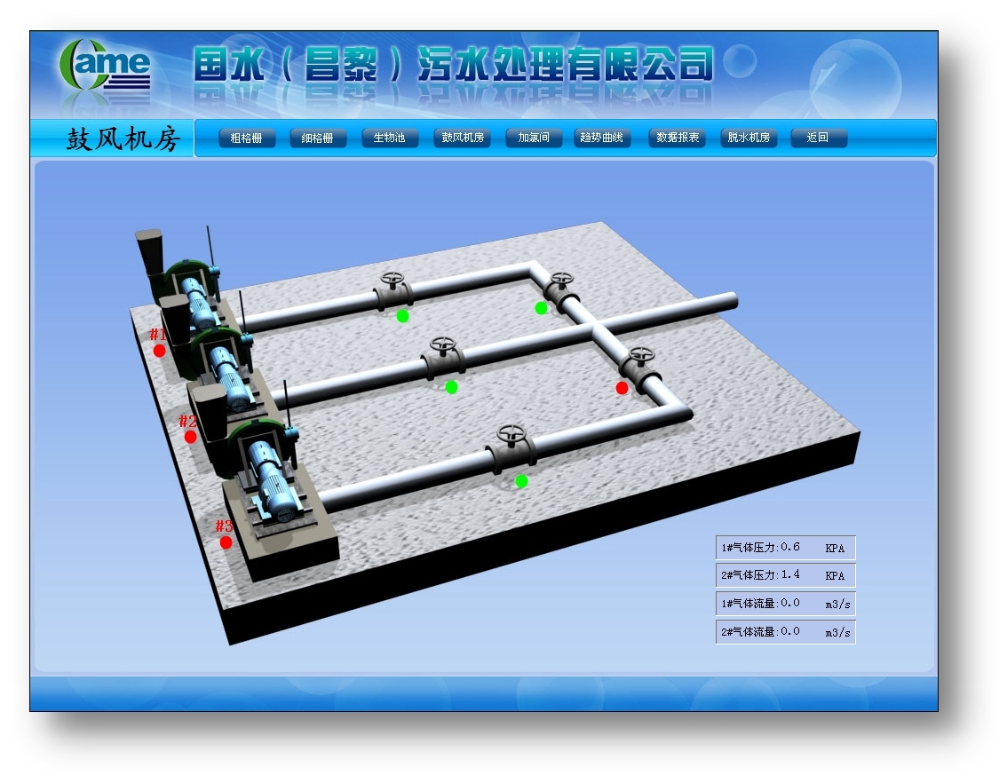 鼓風(fēng)機(jī)房負(fù)責(zé)對反應(yīng)池進(jìn)行鼓風(fēng)曝氣,該鼓風(fēng)機(jī)房設(shè)置3臺鼓風(fēng)機(jī),兩用一備。需要檢測閥門、鼓風(fēng)機(jī)狀態(tài)等參數(shù)。