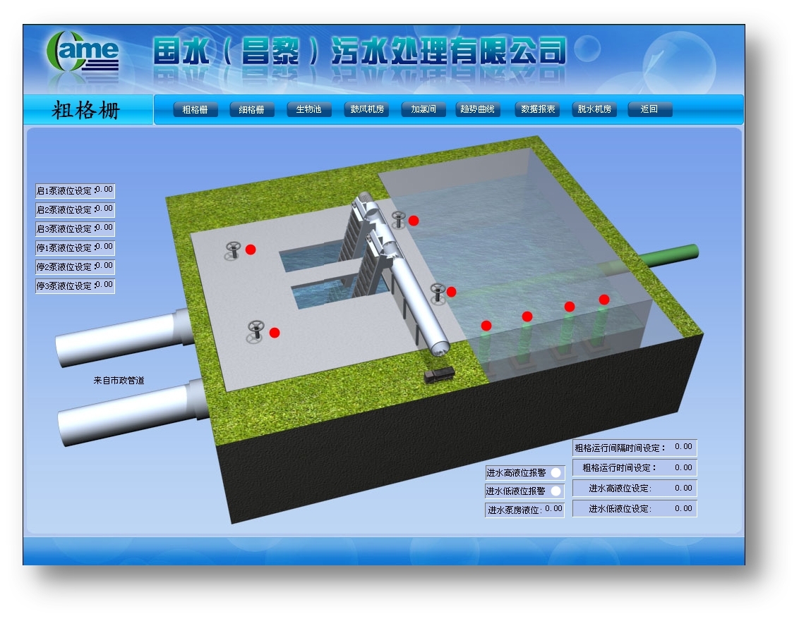 爬式粗格柵,進(jìn)水經(jīng)過粗格柵間過濾一些大的固體雜質(zhì),去除那些可能對水泵有影響的無機(jī)物。需要監(jiān)測格柵水位差、進(jìn)水流量、進(jìn)水酸堿度、進(jìn)水COD、提升泵狀態(tài)等參數(shù)。