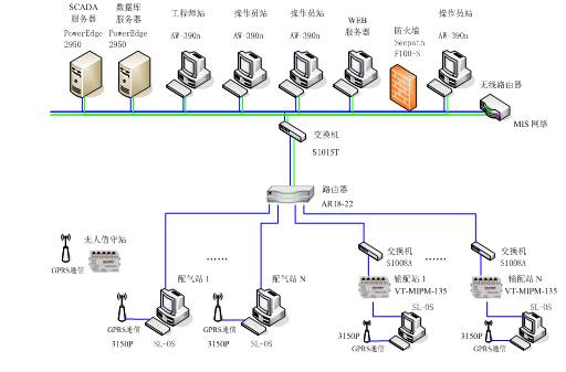 現場通信網絡負責將儀表采集到的數據匯總到數據采集傳輸服務器。標準RS232/485 電氣接口,支持Modbus 通信協議及非標準通訊協議的開發。數據采集傳輸服務器負責對實時數據進行匯總、分析、存儲并與上位機的數據交換。同時,數據采集傳輸服務器還可以負責實現本地監控的人機界面功能,是整個系統的中心環節,也是關鍵環節。