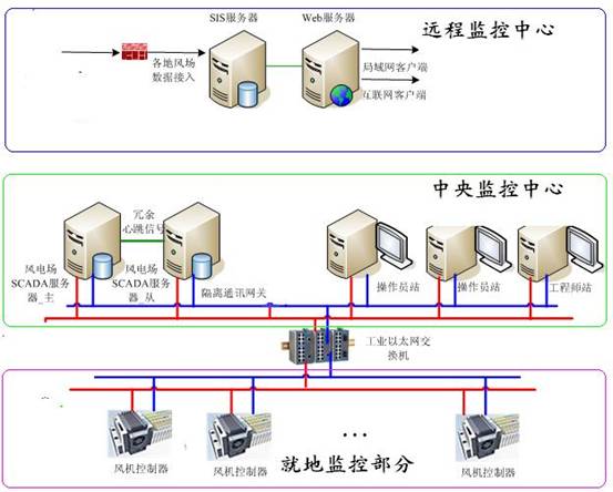 在中央控制室設立了一對互為熱備的實時數據庫服務器,采集和保存所有的現場數據,同時作為報警服務器和事件服務器;根據需要設立一定數目的客戶端節點,作為操作員站;設立一臺工程師站作為組態和維護。風場中央監控中心布置在風電場控制室內,工作人員根據切換畫面隨時控制和了解風電場同一型號風力發電機的運行和操作。風場監控中心通過風電場光纖以太網環路與就地控制室的系統進行通訊。