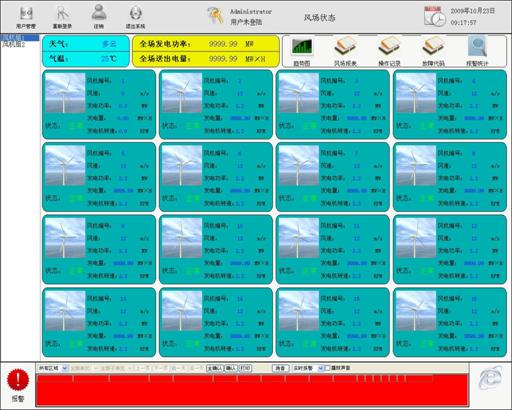 1) 系統的監控畫面顯示風場所有風機、電網線路、以及其他設備的運行情況,重要的運行工況畫面通過一次擊鍵調出,調出時間小于0.5S;調出任何一幅畫面擊鍵不超過三次,每幅畫面能顯示過程變量的實時數據和設備狀態,這些數據和狀態每秒更新一次,顯示的顏色或圖形隨過程工況而變化。系統提供的畫面數量、每幅畫面的圖素及實時更新和被控的過程點幾乎不受限制。系統提供標準的顯示畫面,如風場總覽顯示、風機列表顯示、趨勢顯示、成組顯示、棒狀圖顯示等標準畫面。