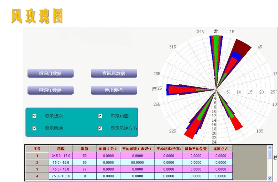 ② 系統(tǒng)顯示各臺機(jī)組的運(yùn)行數(shù)據(jù)。如每臺機(jī)組的瞬時發(fā)電功率、累計發(fā)電量、發(fā)電小時數(shù)、風(fēng)輪及電機(jī)的轉(zhuǎn)速和風(fēng)速、風(fēng)向等,將下位機(jī)的數(shù)據(jù)調(diào)入上位機(jī)并顯示,必要時還可以用曲線或圖表的形式直觀地顯示出來。