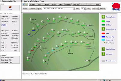 ③ 系統(tǒng)顯示各風(fēng)電機(jī)組的運(yùn)行狀態(tài)。如開機(jī)、停車、調(diào)向、手/自動控制以及大/小發(fā)電機(jī)工作等情況,通過各風(fēng)電機(jī)組的狀態(tài)了解整個風(fēng)電場的運(yùn)行情況。