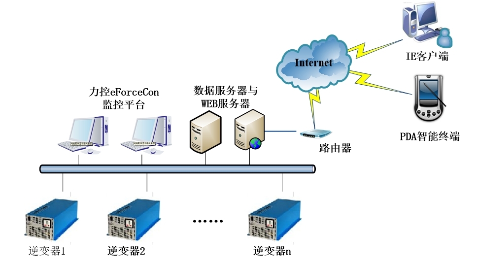 光伏逆變器/通信模塊可通過光纖、以太網、RS485總線等任意形式連接至主控室的上位機操作員站,實現監控整個光伏系統,系統架構圖如下: