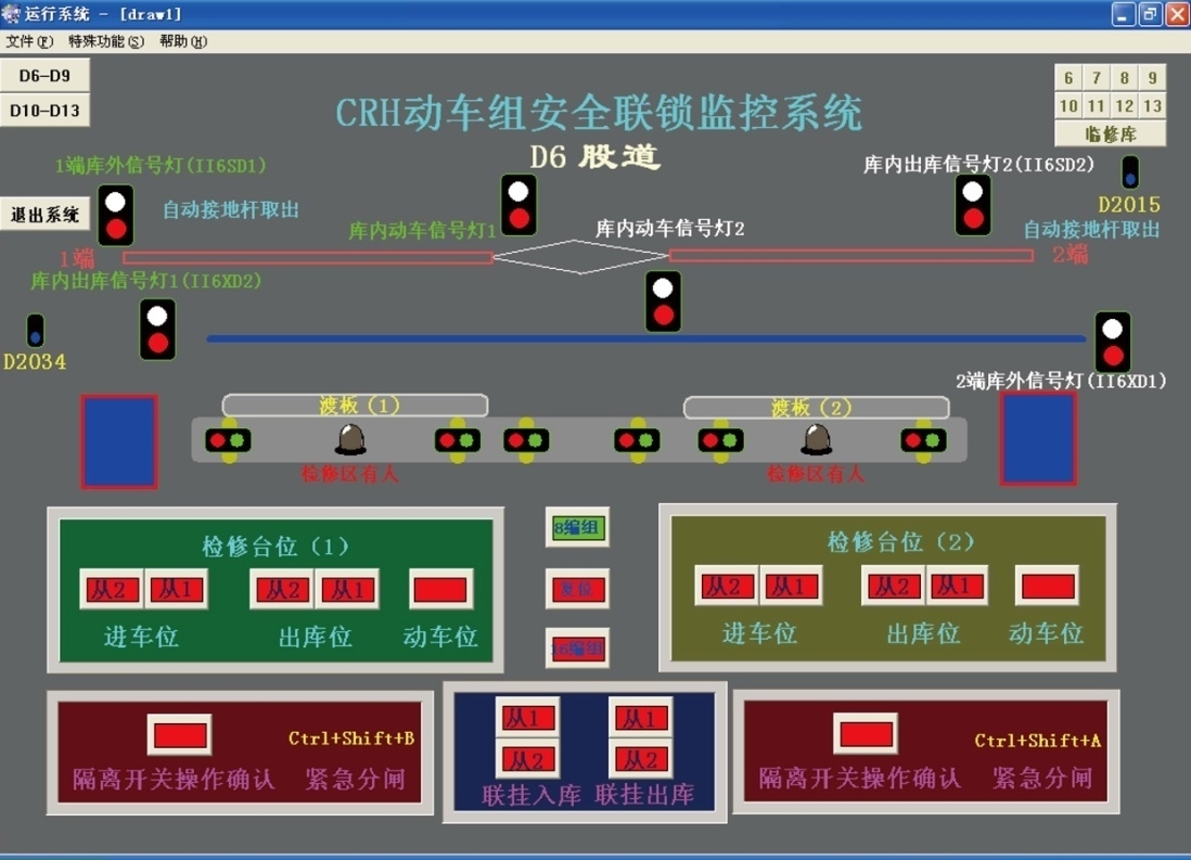 2)動車段中修庫適用于動車車輛每運行30萬公里,主要對動車走行部進行更換、維修工作。庫內除檢查庫的檢修平臺外,還設有固定式架車機、移動式架車機、天車、側移式接觸網等設備。除檢查庫的安全聯鎖設備以外,將這些設備納入到聯鎖控制系統中。例如:天車和側移式接觸網之間互鎖,不允許同時動作;移動式架車機和固定式架車機的復位信號作為允許車輛動作的必要條件。