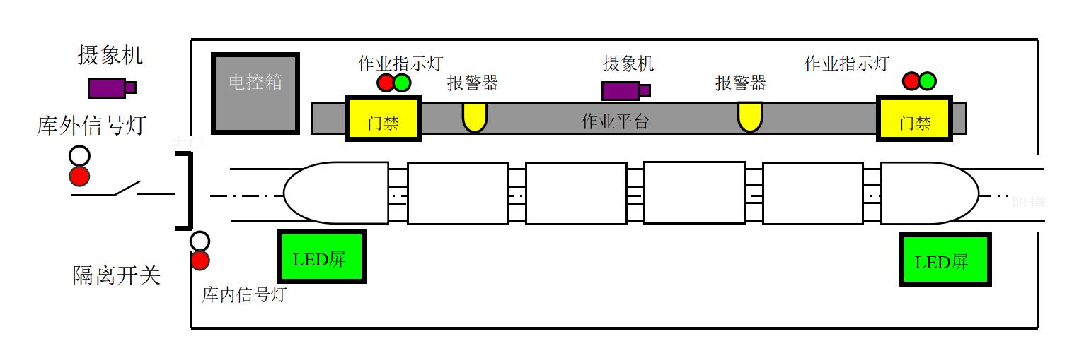 庫外25米處設有入庫信號燈,庫大門處設有出庫信號燈。3層檢修平臺入口設有電磁門禁鎖和門禁指示燈,檢修人員使用經過授權的門禁卡才能上下3層檢修平臺。庫前端設有電控箱,可對庫外隔離開關進行遠程控制。視頻監控系統通過庫內和庫前的攝像頭對隔離開關和庫內人員作業進行監視控制。其布局如下圖1所示:
