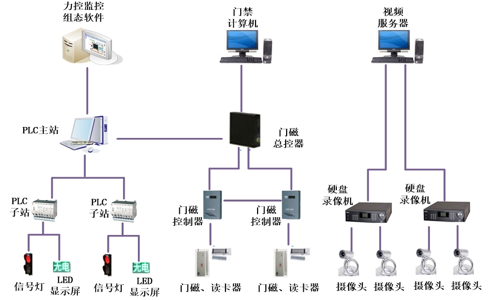 門禁子系統設有專門的門磁控制器,安裝在各個檢查庫,數據通過專線傳輸到門磁總控器,所有門禁數據可在專設的門禁計算機中顯示。同時PLC主站可調取門磁總控器的數據,上傳到力控監控組態軟件實時顯示各個門禁的狀態。