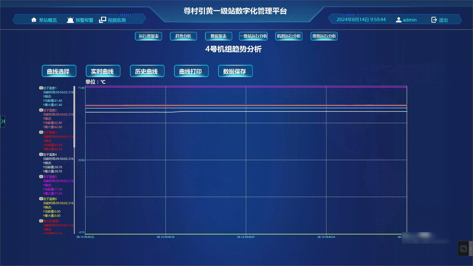 可查詢泵站、單機(jī)、班組的各項(xiàng)指標(biāo)變化趨勢(shì),選擇需要查詢的機(jī)組編號(hào),對(duì)比查看任意曲線。