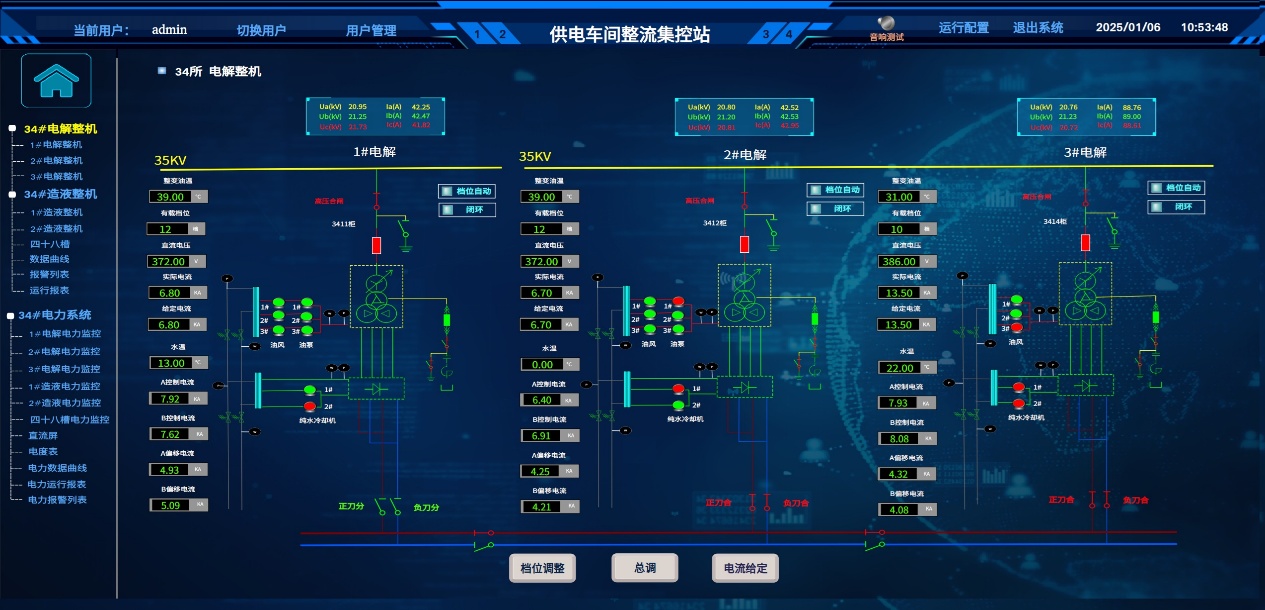 金川集團冶煉廠項目的核心是建設動力廠整流所集控一體化平臺,通過部署基于國產化操作系統下的軟件生態,包括力控跨平臺監控組態軟件ForceSCADA、一體化生產管控平臺FinforWorx、企業級實時歷史數據庫pSpace等,實現對8個整流所、30臺整流機組及配電設備的實時監控,并集成視頻數據與關鍵參數分析功能,支撐生產指令精準下發與異常預警。同時,平臺預留多系統數據通道與設備冗余架構,為冶煉廠生產指揮中心建設和“智慧動力”建設夯實基礎。
