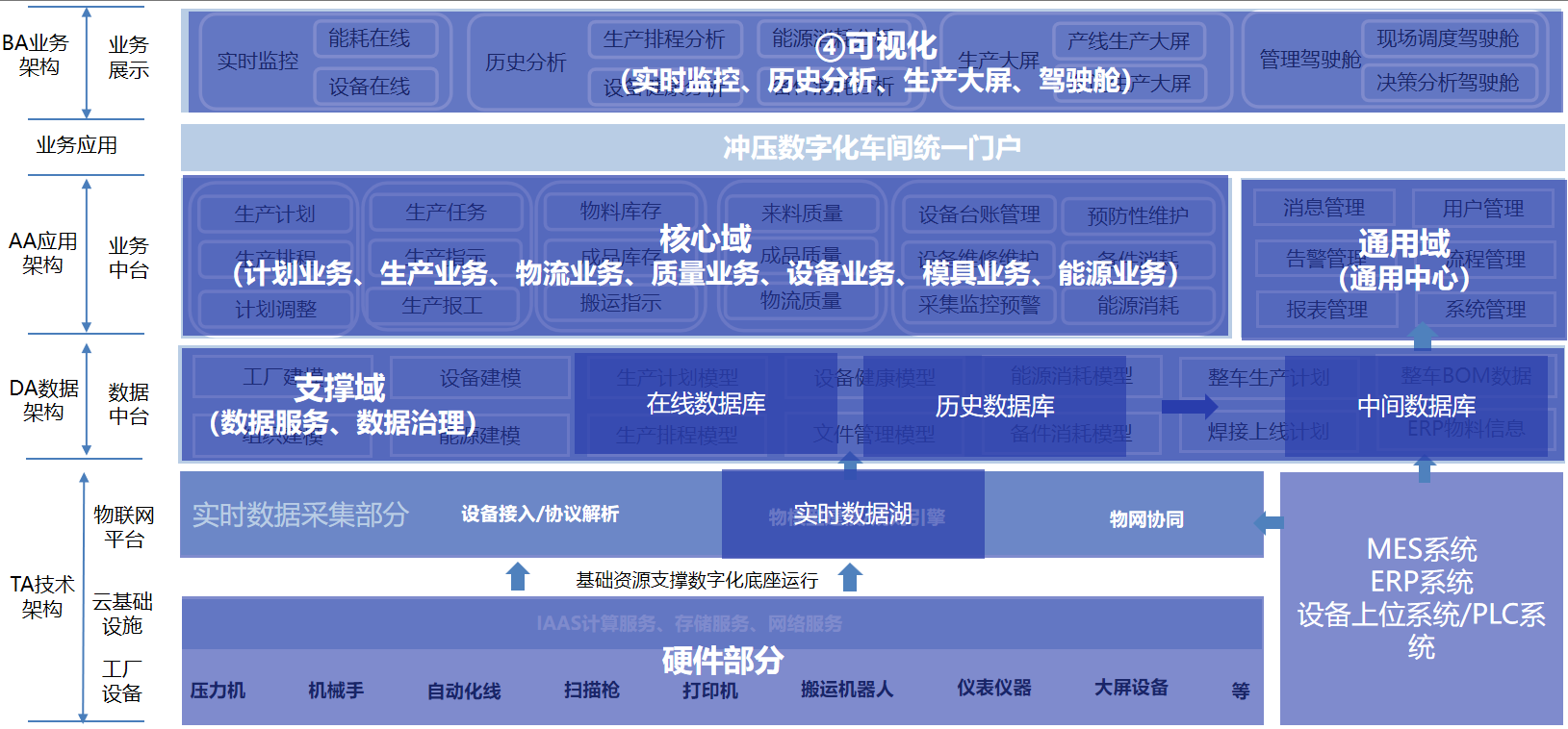 力控沖壓MES管理系統采用4A架構:在TA層,通過IOT物聯技術實時采集產線設備運行與生產過程數據;在DA層,通過數據治理實現業務數據與時序數據的融合綁定;在AA層,集成工廠業務系統,打通車間業務流程壁壘;在BA層,結合3D技術與業務管理要求,構建看-管-控一體化管理平臺