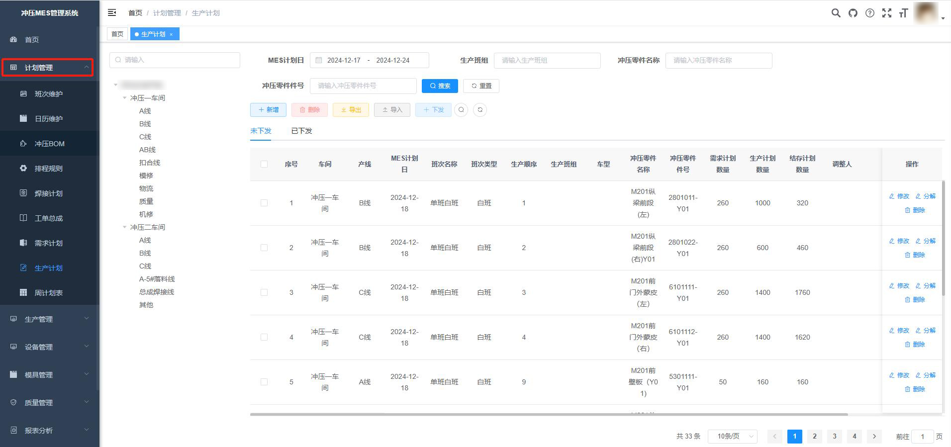 沖壓MES管理系統通過其智能排產功能,對生產過程進行高效調度與優化。系統自動整合ERP的周/日生產計劃與LES的零部件庫存信息,并綜合考量盛具狀態、捆包數等關鍵排產因素,生成優化的沖壓生產線排產計劃。該方案有效保障了生產連續性,顯著提升生產效率和產品質量。