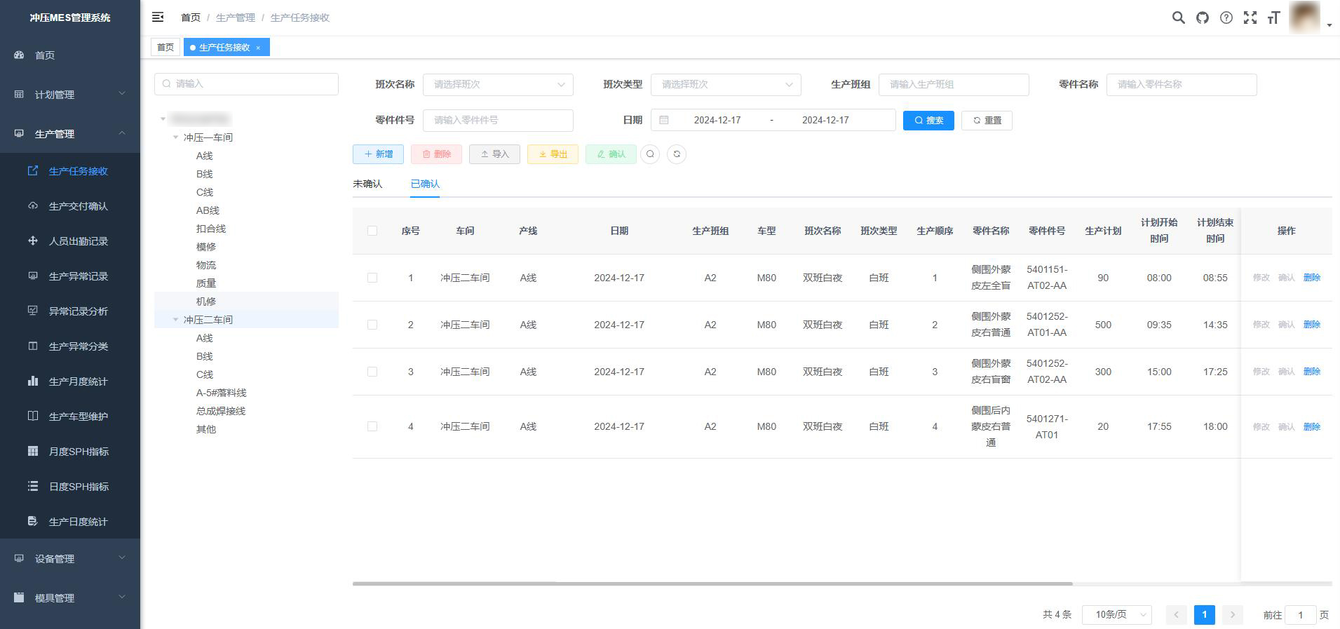 沖壓MES系統不僅提供車間總覽功能,實時展示各項管理指標,還集成生產監控、計劃排程、質量管理、設備管理、模具管理及報表分析等核心模塊,實現全流程數字化管控。