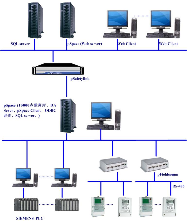本系統實時采集存儲全公司風水電氣數據,分析后提供決策層,分三級管理。首鋼氧氣廠為測試點,采用德國GMC硬件與力控軟件實現數據采集、顯示、存儲、查詢、報表打印及報警功能。