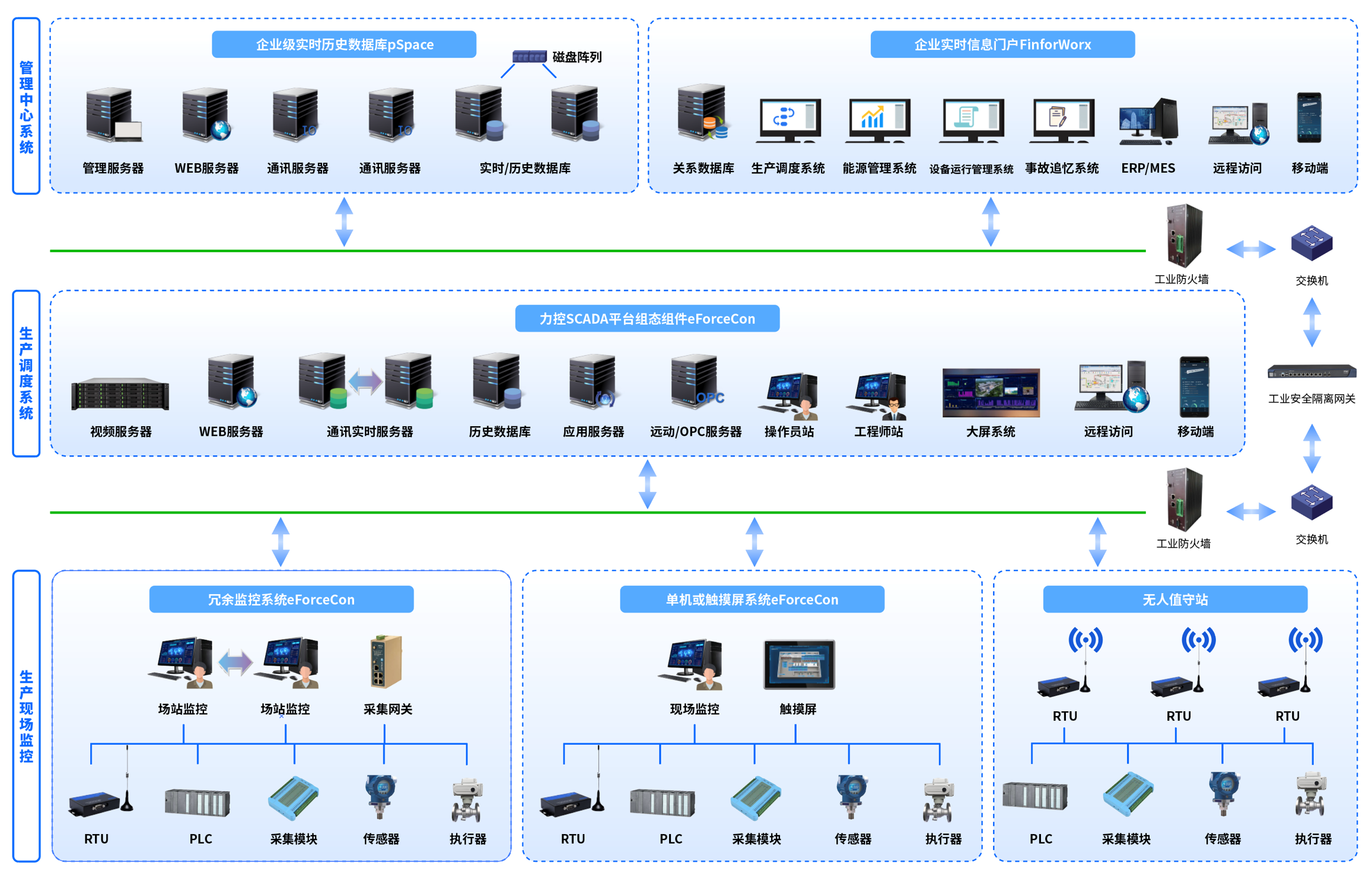 從產業鏈安全角度看,SCADA平臺支持全國產化技術棧,與主流操作系統、CPU及主機、PLC等設備廠商完成了兼容認證,可在異構平臺混合交叉部署。從外部防護角度看,力控科技關注工控系統本質安全,依托自主的工業防火墻、安全隔離網關、安全審計等防護產品形成了成熟的工控信息安全方案。