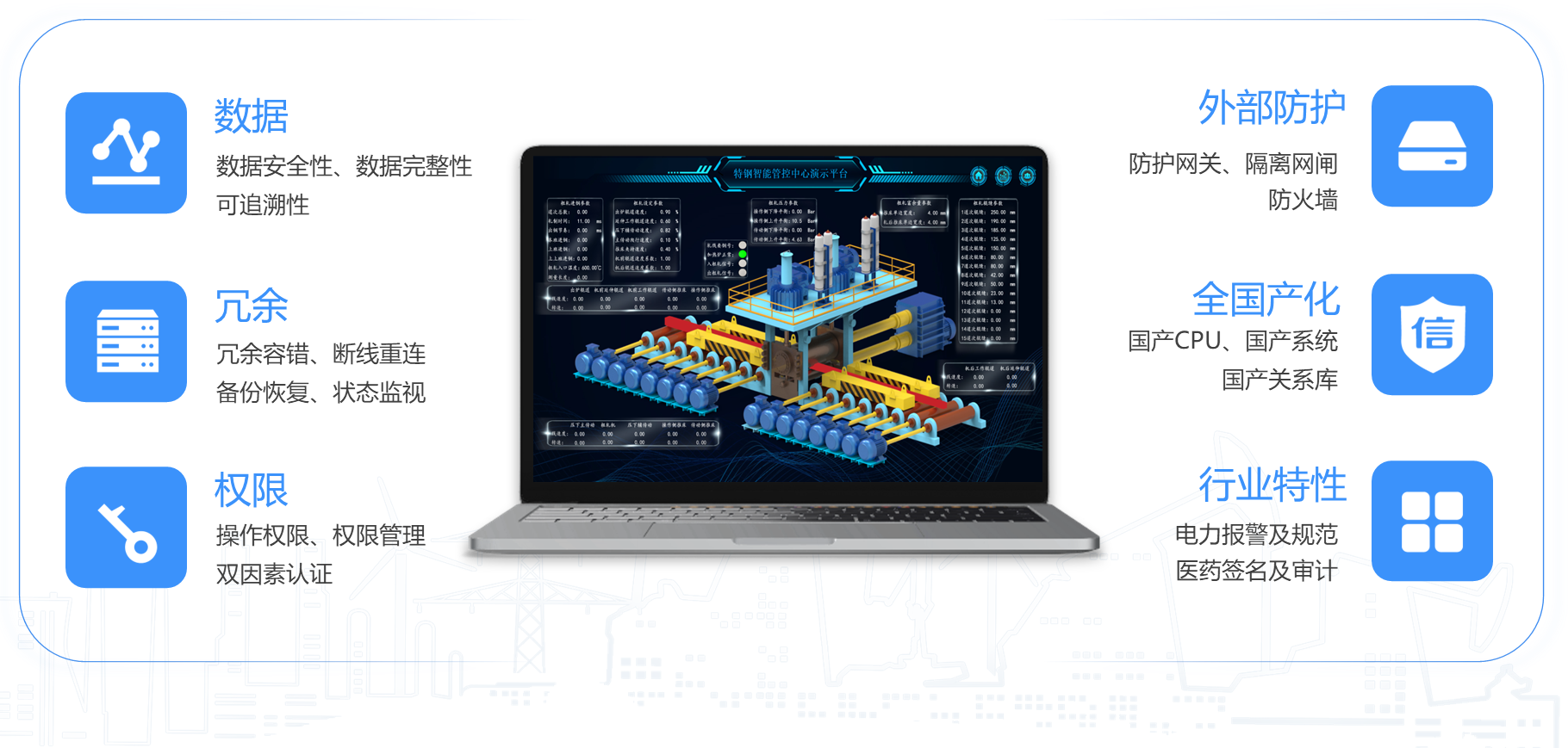 針對逐步升級的挑戰,力控科技提出的SCADA 系統安全防護設計方案兼顧內生安全與外部防護。工業SCADA平臺軟件遵循GB 40050-2021網絡關鍵設備安全通用要求等系列標準規范,提供了適合大型分布式系統場景的冷溫熱冗余、多級權限、用戶身份標識與鑒別、測點級訪問控制、防重放攻擊的通信安全、日志審計、電子簽名、備份恢復、異常檢測等一系列安全機制。