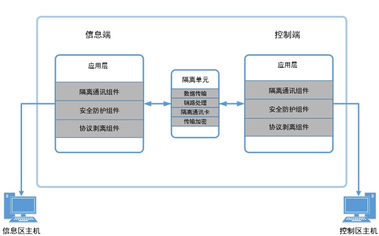 由兩個獨立主機系統組成,一端的主機系統為控制端,用于連接控制網絡。另一端的主機系統為信息端,用于連接信息網絡。兩端主機均采用高性能嵌入式硬件,主板上各有多個以太網接口用來連接要隔離的兩個網絡,兩端主機通過隔離裝置進行連接,保證數據交互的安全性。