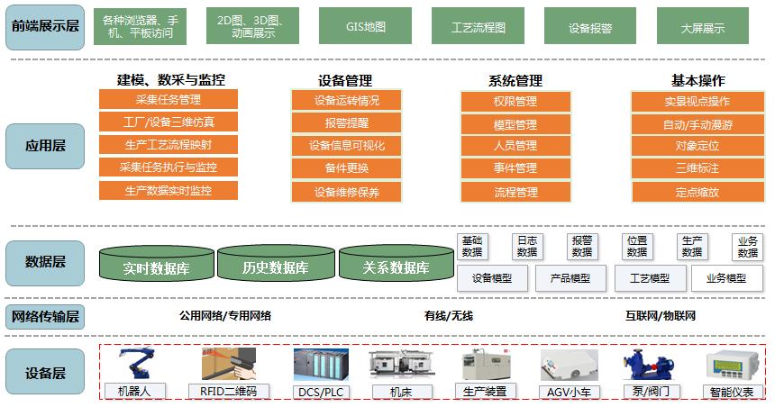 ● 三維可視化。通過構建物理實體三維幾何模型,為各個場景如園區(qū)、建筑物、生產(chǎn)車間、生產(chǎn)設備、監(jiān)控設備等幾何模型添加信息屬性,并與相應位置IOT數(shù)據(jù)結合,實現(xiàn)云端三維可視化。