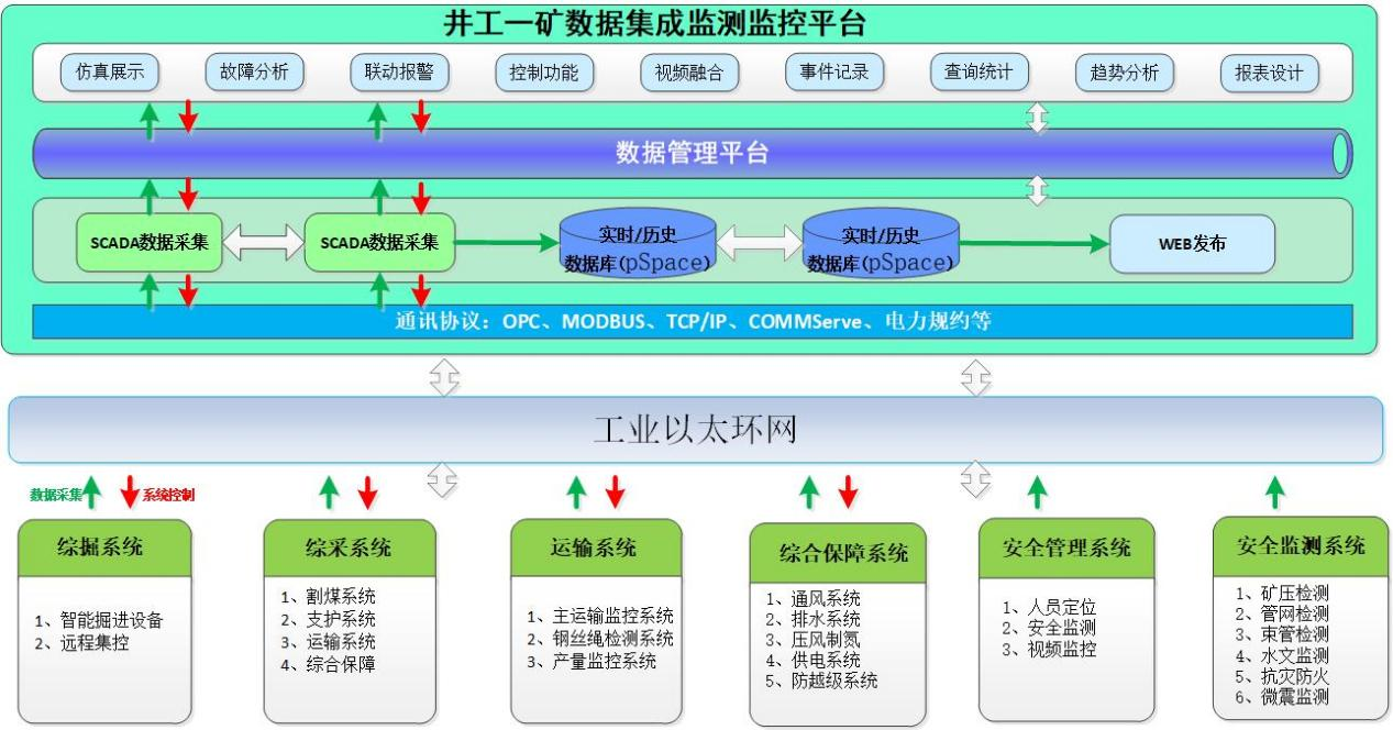 煤礦數據集成監測監控平臺通過各子系統的數據采集、轉換、傳輸、顯示與存儲。徹底解決了“信息孤島”現象,其穩定、可靠、高速、多平臺的真正融合在實際應用中得到了較為理想的綜合顯示效果。