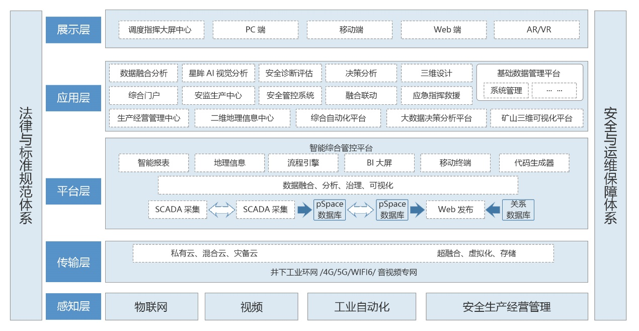 煤礦智能綜合管控平臺解決方案充分利用云平臺、大數據、云計算等先進技術,對煤礦生產系統、安全監控系統數據等主要生產環節進行全流程的實時監控,根據業務需求構建分析預測模型,根據監測與分析計算結果,實現流程的智能協同控制。通過應用超融合、私有云等新技術的應用,建設煤礦超融合數據中心。