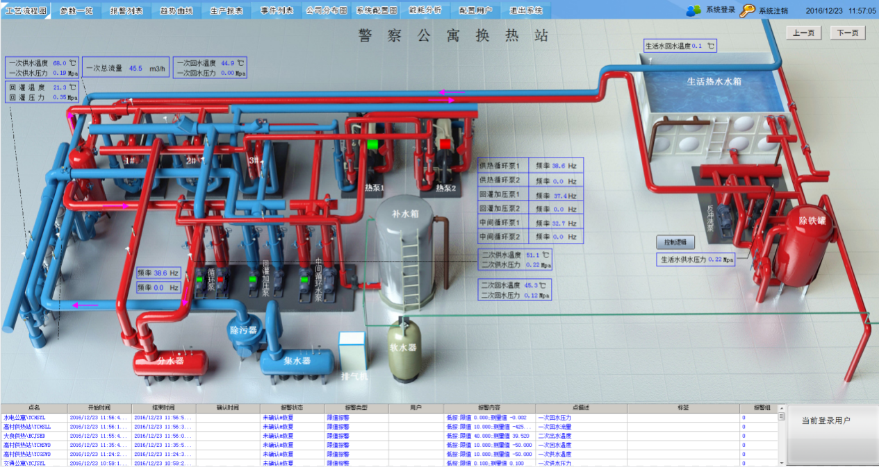 供熱能效考核,提高利潤供熱過程監(jiān)控可以完成運(yùn)行管理人員對供熱運(yùn)行狀態(tài)的了解,可以顯示整個(gè)供熱系統(tǒng)部分參數(shù)運(yùn)行狀態(tài)一覽表,如當(dāng)前換熱機(jī)組的主要運(yùn)行參數(shù),以及工藝流程圖等,指導(dǎo)相關(guān)人員完成生產(chǎn)過程、系統(tǒng)或設(shè)備分析,更好地進(jìn)行操作調(diào)整與管理決策。