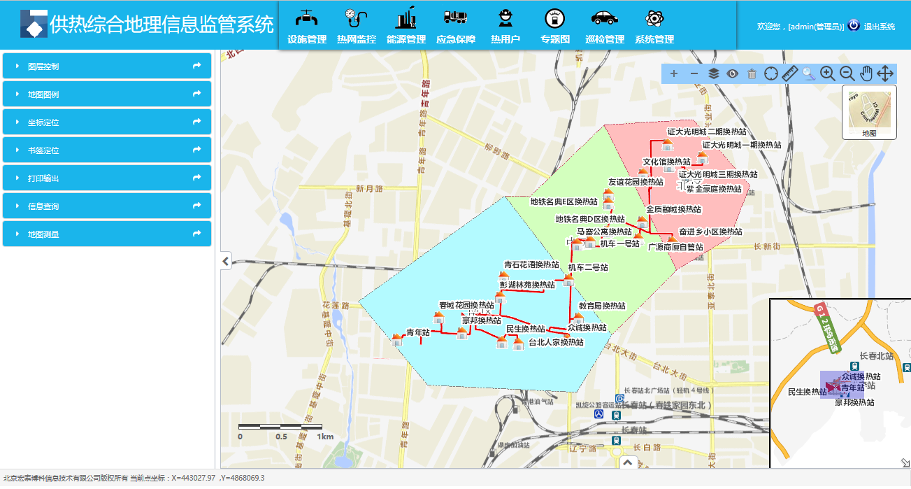 建立基于GIS的城市熱網(wǎng)管理信息系統(tǒng),并且與監(jiān)控調(diào)度系統(tǒng)無縫集成,通過地理系統(tǒng)實(shí)時(shí)查看各種生產(chǎn)數(shù)據(jù),實(shí)現(xiàn)對城市熱網(wǎng)綜合管理,能隨時(shí)掌握全市輸配系統(tǒng)的最新資料,供有關(guān)部門管理集中供熱管網(wǎng)、規(guī)劃設(shè)計(jì)、運(yùn)行調(diào)度、決策使用。