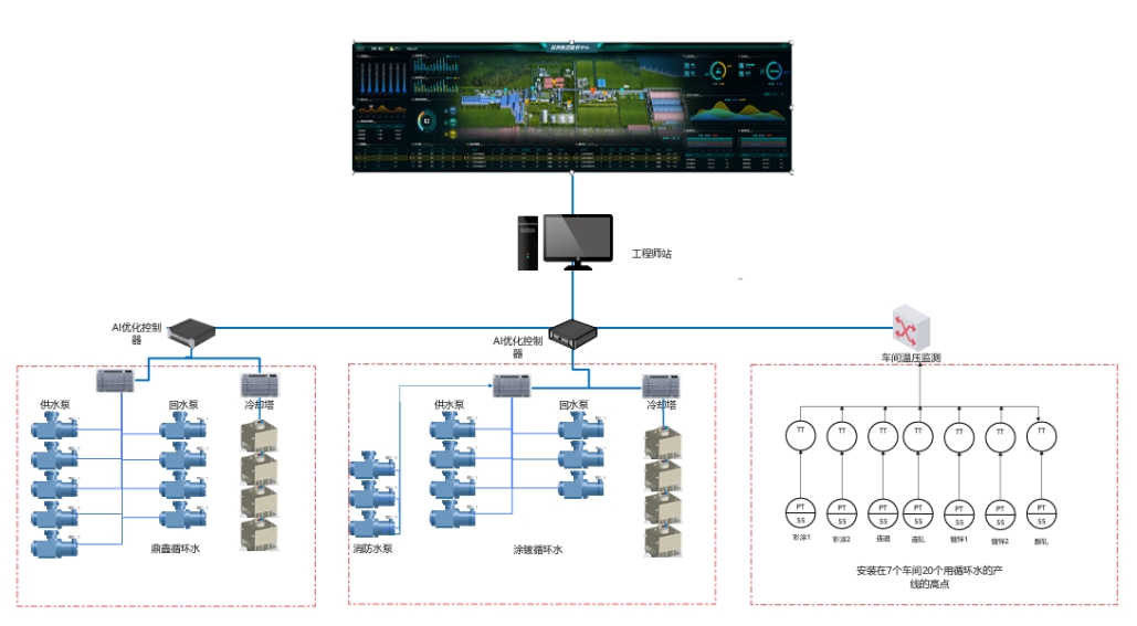 實現循環水系統管網壓力、溫度、流量、液位等數據可視,環泵頻率可調,冷卻塔數量可變,管網閥門可調;